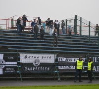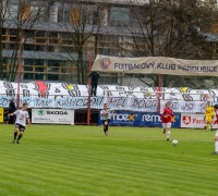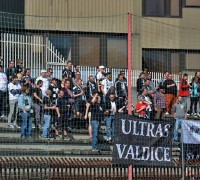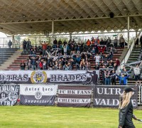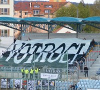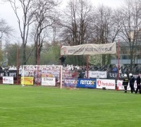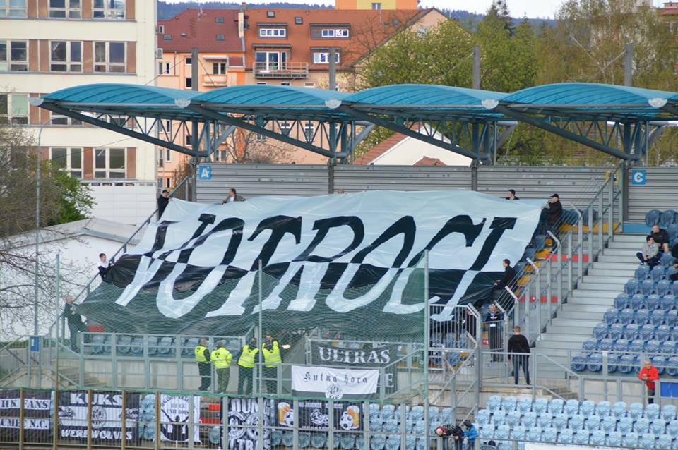 Venkovní prezentace jsme na jaře měli hned čtyři. Ve FM jsme se prezentovali plachtičkou HRADEČÁCI ON TOUR, která nebyla zrovna nějak ideální, ale při počtu 12 lidí v sektoru potěší jakákoliv prezentace. Naše další akce proběhla v Budějovicích, kde jsme použili celosektorovou černobílou plachtu VOTROCI, která se opravdu povedla, ještě pod ní mohli hořet nějaké dýmy a bylo by to parádní.