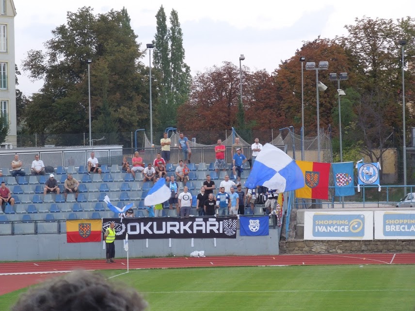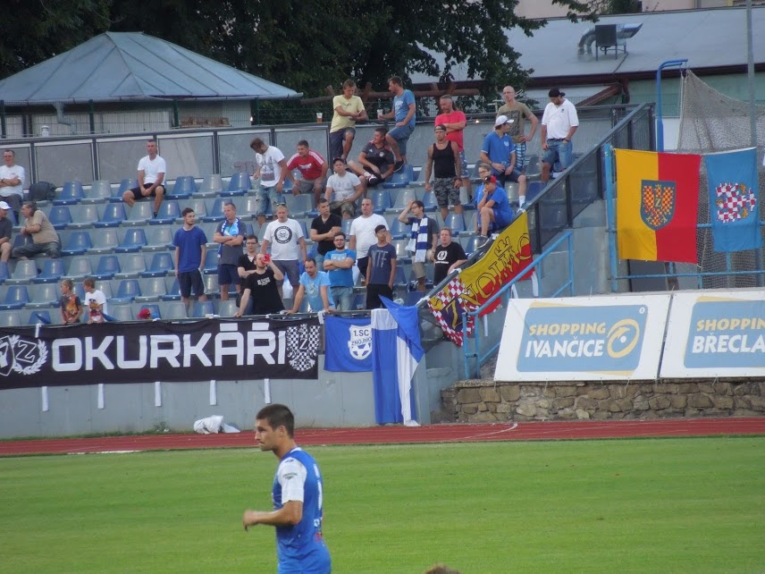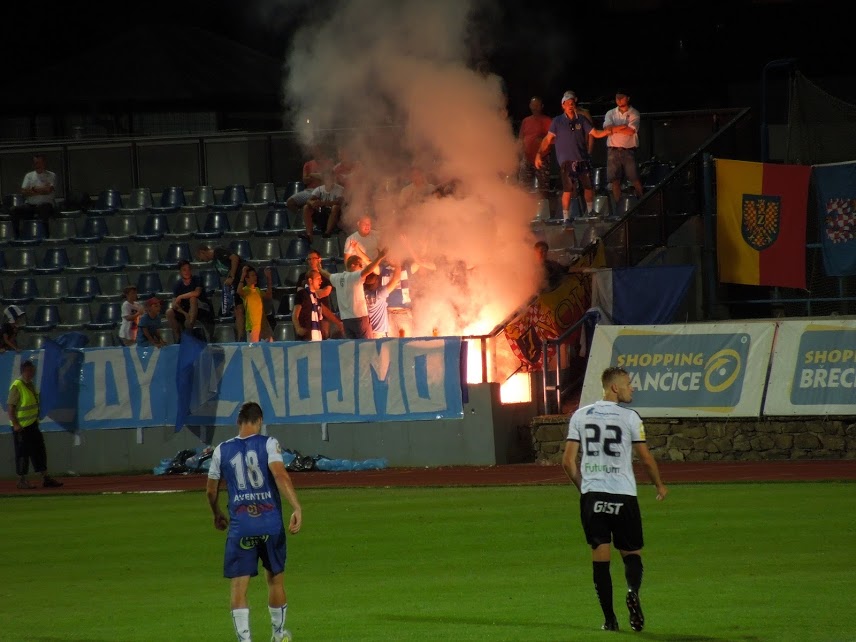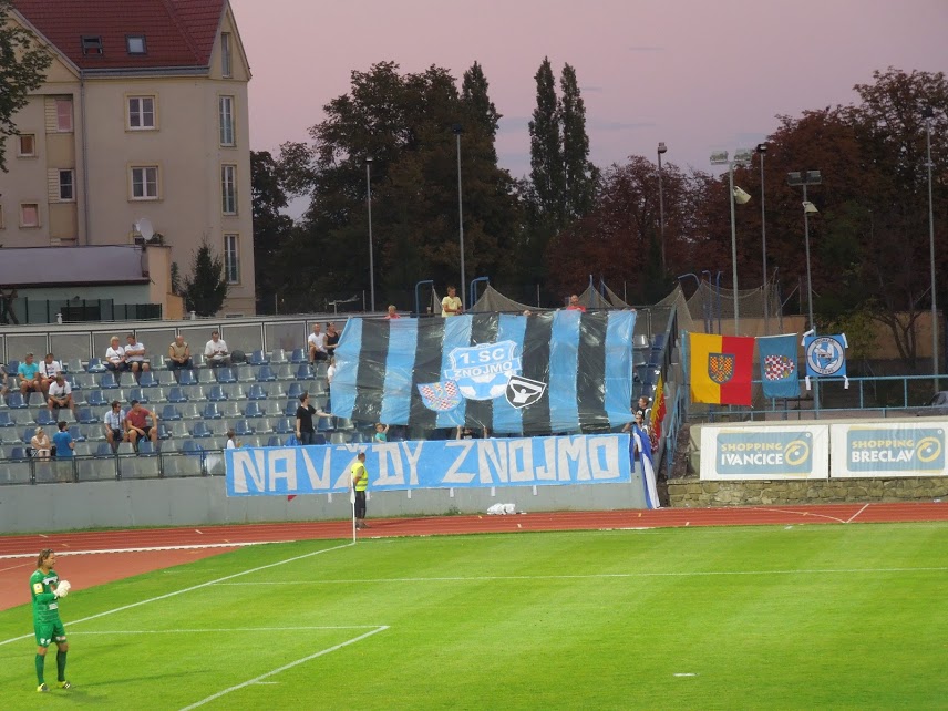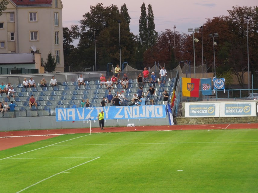 Do Znojma jsme vyrazili po vlastní ose, auty. Po příjezdu ke stadionu čekáme před zamčenou bránou do sektoru pro hosty. Dvacet minut před začátkem si nás všimne pořadatel a nasměruje nás do našeho sektoru jinou cestou (pozn.: na webu Znojma nikde ani zmínka o změně). Přicházíme tedy k tzv. novému vstupu do sektoru a zde po nás chtějí lístky. Snažíme se zde vysvětlit, že mají mít lístky připravené oni a my si je zakoupíme u svého sektoru jako je to všude jinde. Lístky však pořadatelé neměli, údajně jsme se měli někomu nahlásit, že do Znojma dorazíme (pozn.: takže když pojedu někam na výlet, tak abych se taky hlásil dva dny dopředu). Nakonec nám sdělují, že lístky lze nakoupit pouze u hlavní tribuny, takže jsme museli celý stadion obejít, koupit lístky a zase se vrátit. Proč to dělat jednoduše, když to jde složitě – DEMENCE! Dalším problémem bylo občerstvení, které nebylo žádné, a tak jsme si pro něj museli chodit s pořadateli na druhou stranu stadionu.