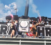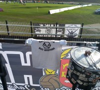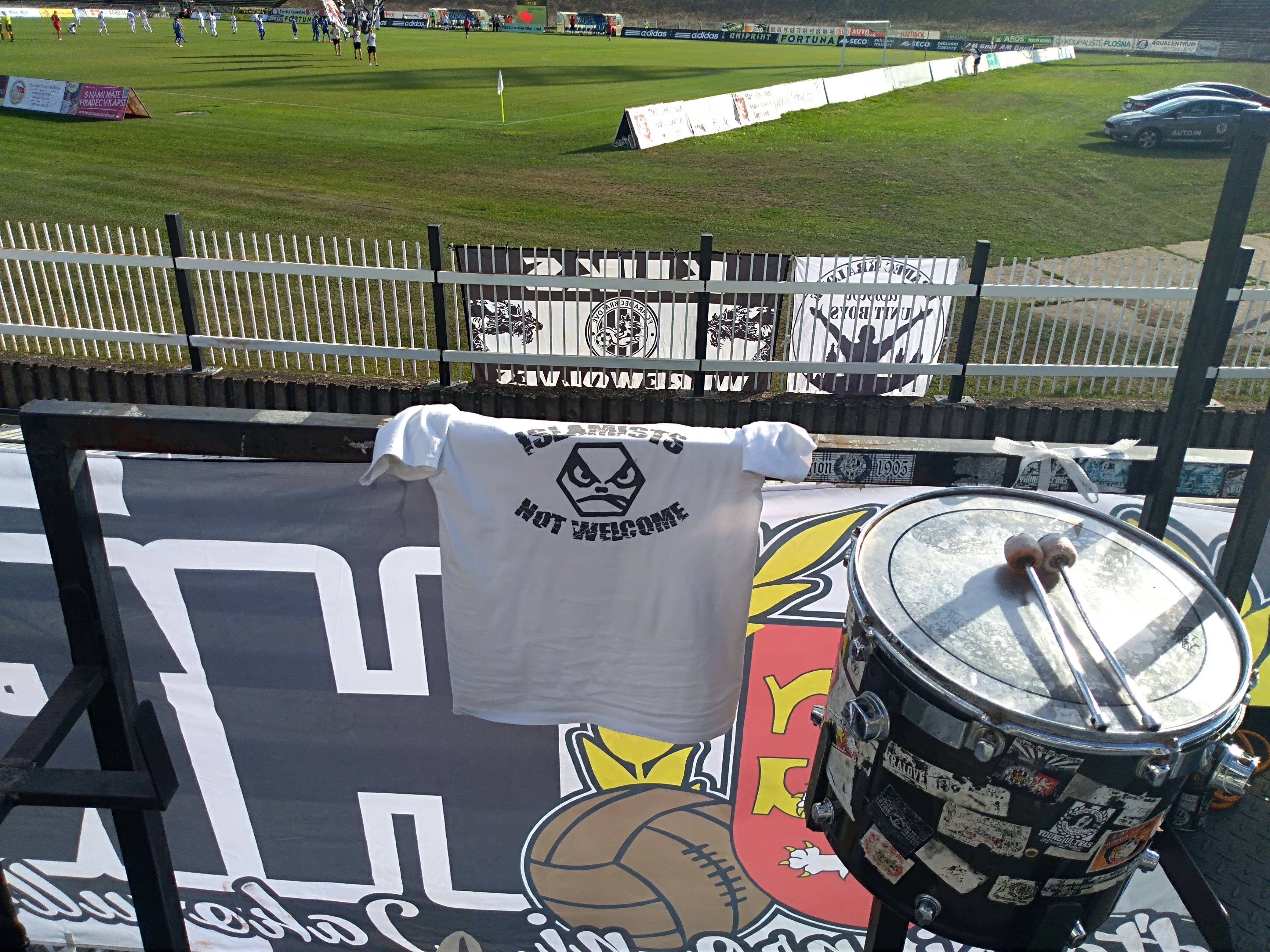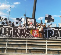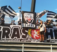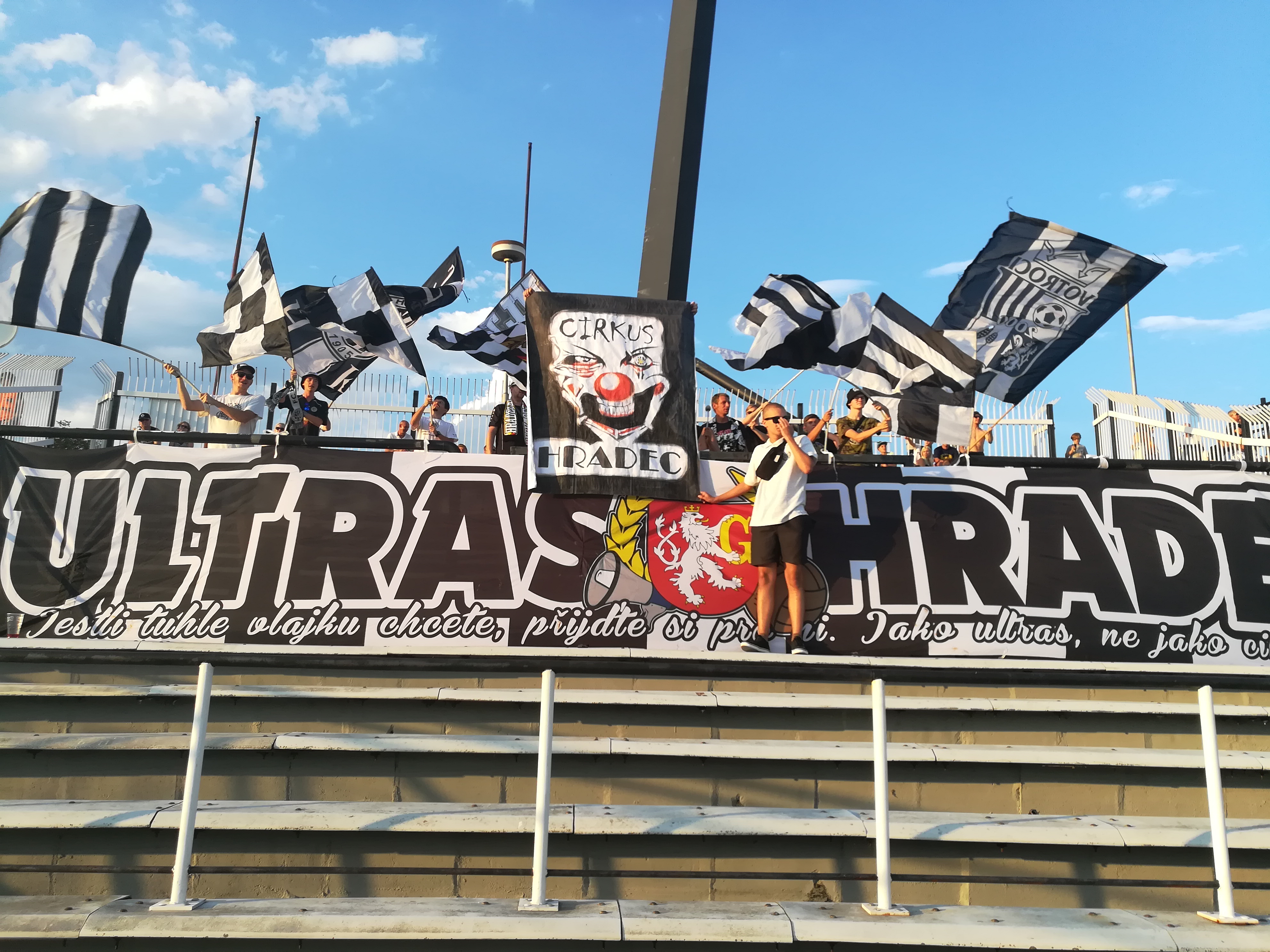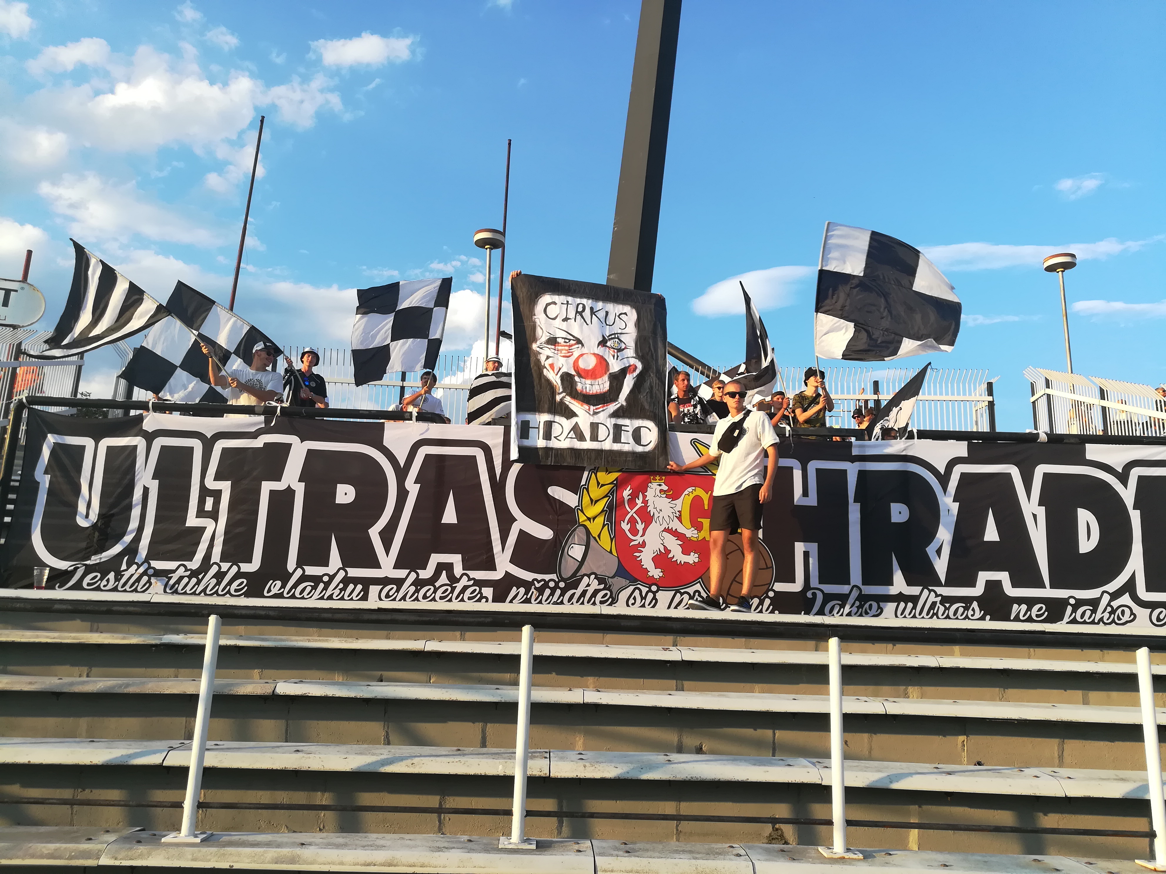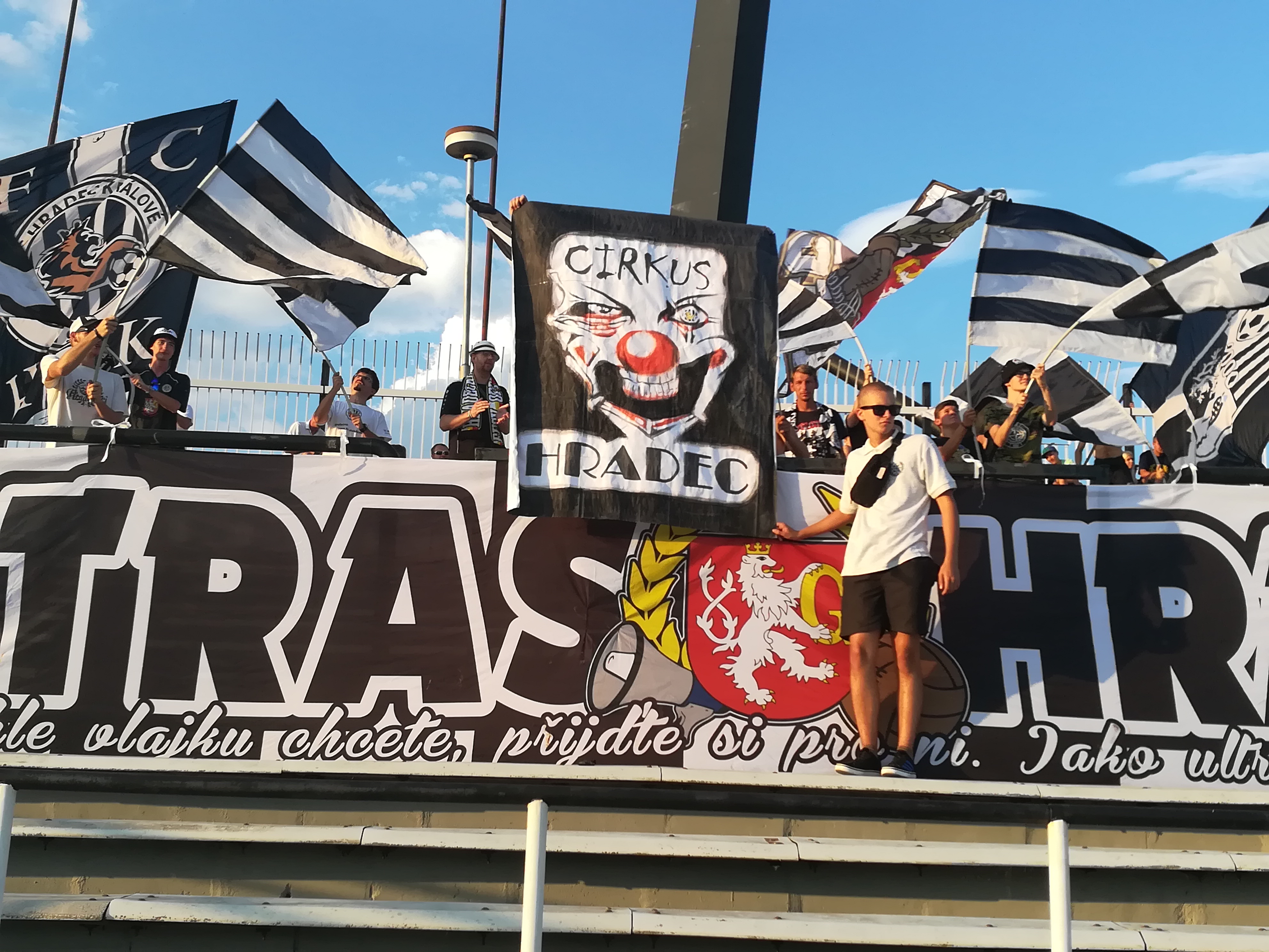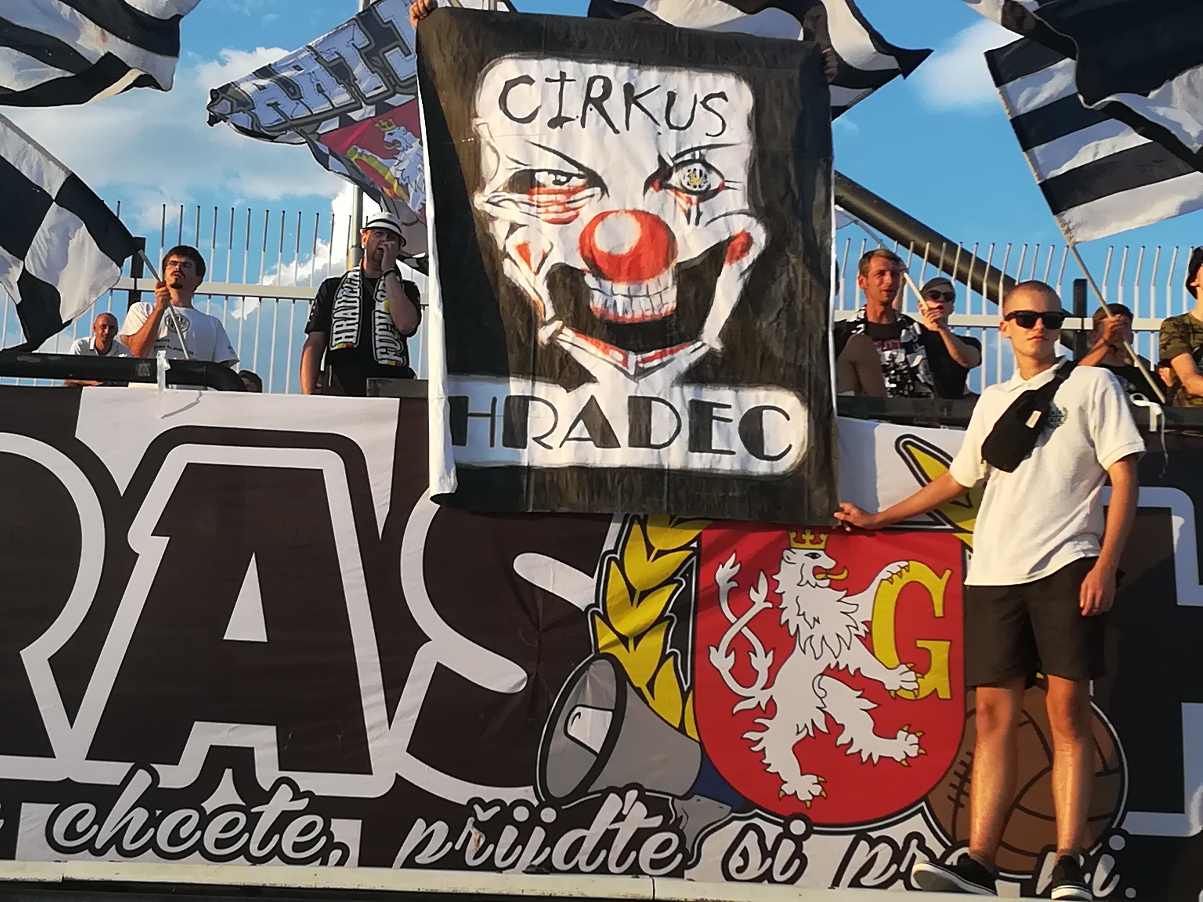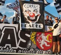 Ve druhé půli se prezentujeme ještě jednou. Roztahujeme transparent Cirkus Hradec, který doplňujeme o mávací černobílé vlajky.
