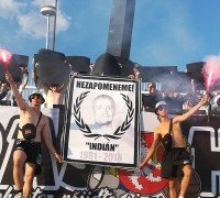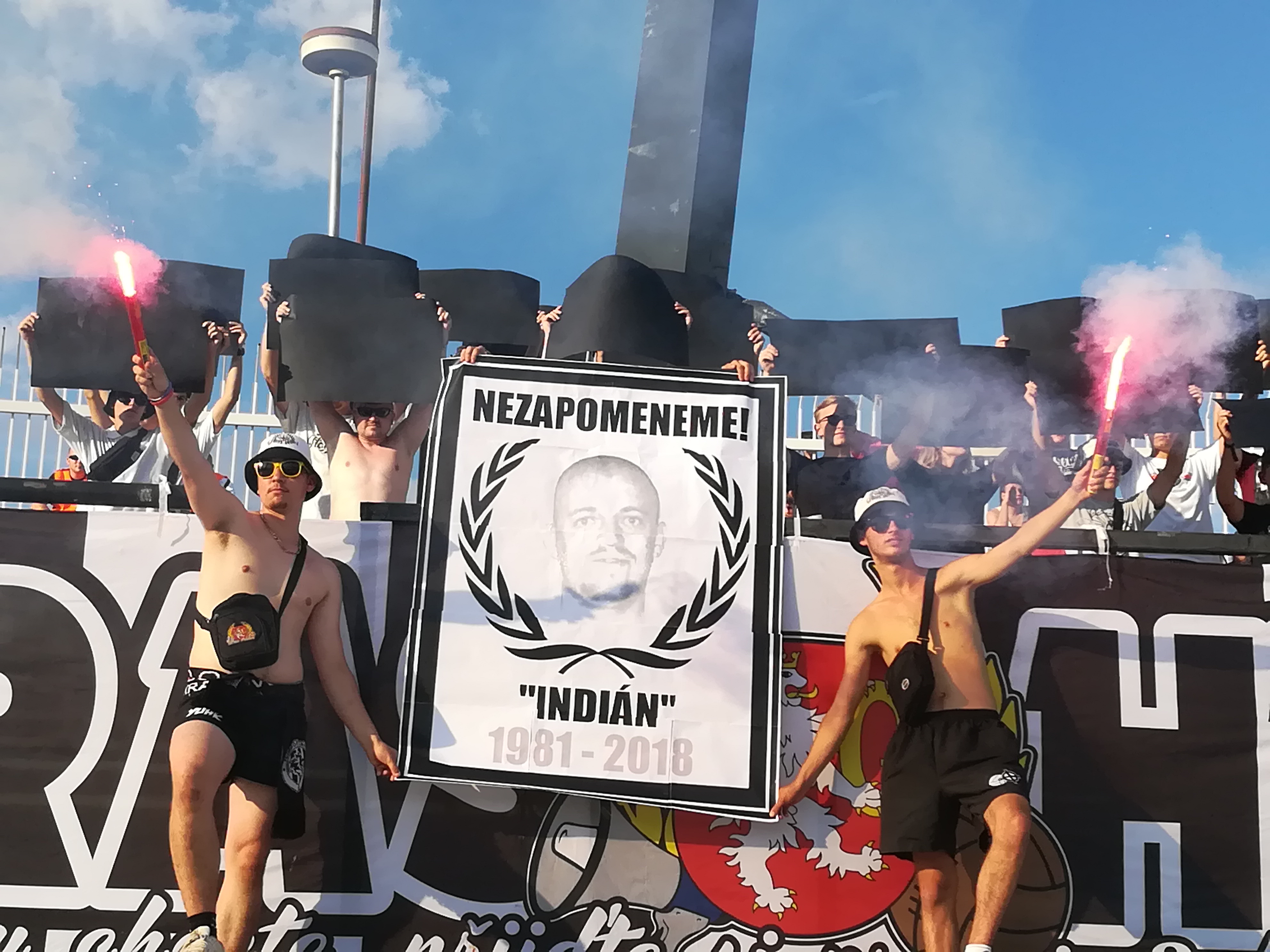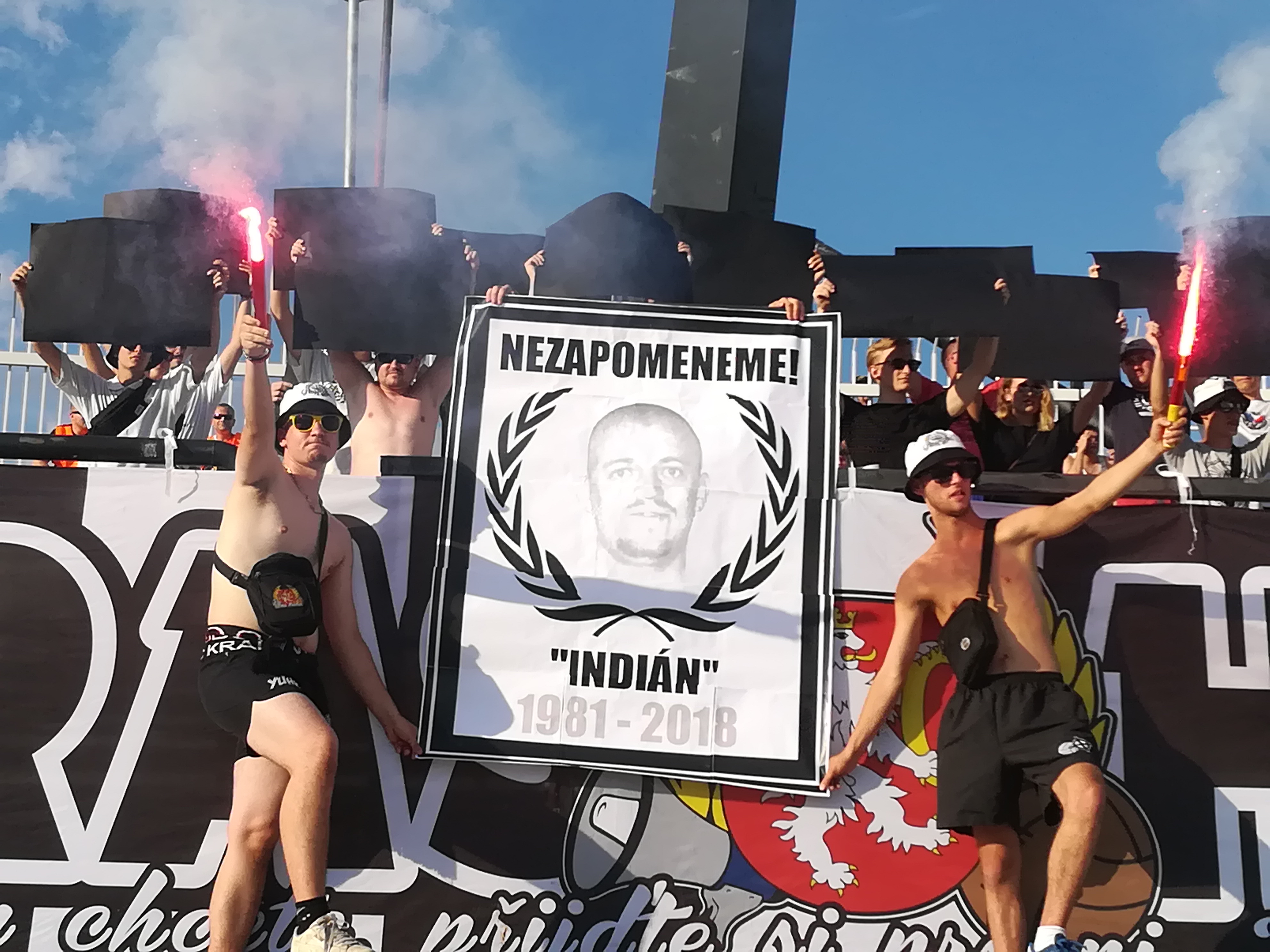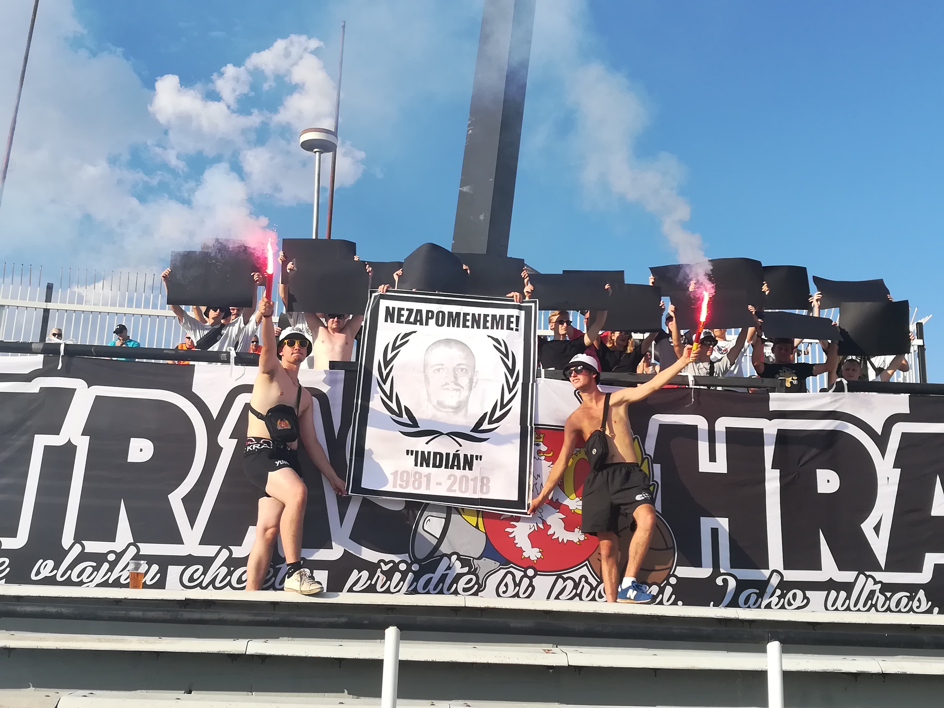 V sektoru se nás schází asi třicet, z toho pouze dvacet aktivních, kteří chtějí fandit. Vyvěšujeme vlajky UH, KW, YUHK a UBHK. Fandíme s prodlevami, na přímém slunci se musíme hodně občerstvovat. V 37. minutě se prezentujeme plakátem s podobiznou “Indiána” (pozn.: votrok z Opatovic, který v předešlých dnech zemřel), plakát byl doplněn o dva symbolické červené ohně a černé kartony.