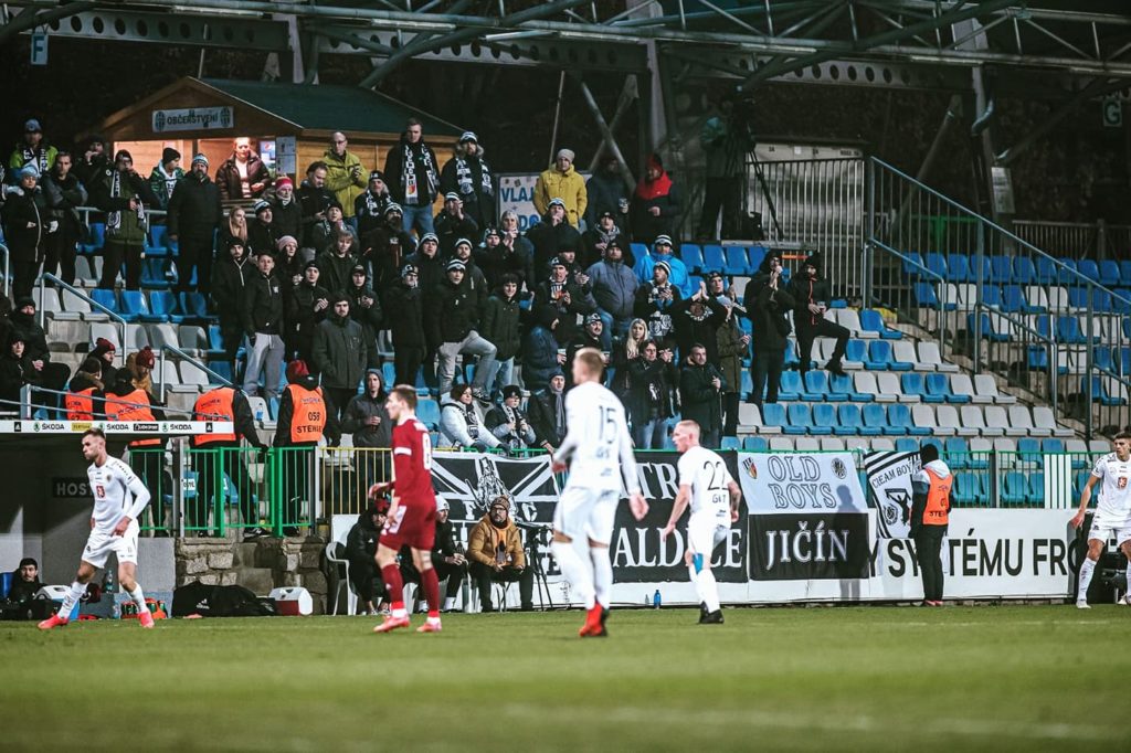 Hlasatel v Mladé Boleslavi ohlásil 1 000 diváků, což byla maximální povolená kapacita na toto utkání. Hradeckých se v sektoru schází několik desítek, mají ověšený sektor vlajkami a prezentují se slušným fanděním. Opět nám chybí buben, který by držel rytmus, ale vzhledem k tomu, že jsme vynechali rytmické chorály, tak nebyla absence vůbec znát.