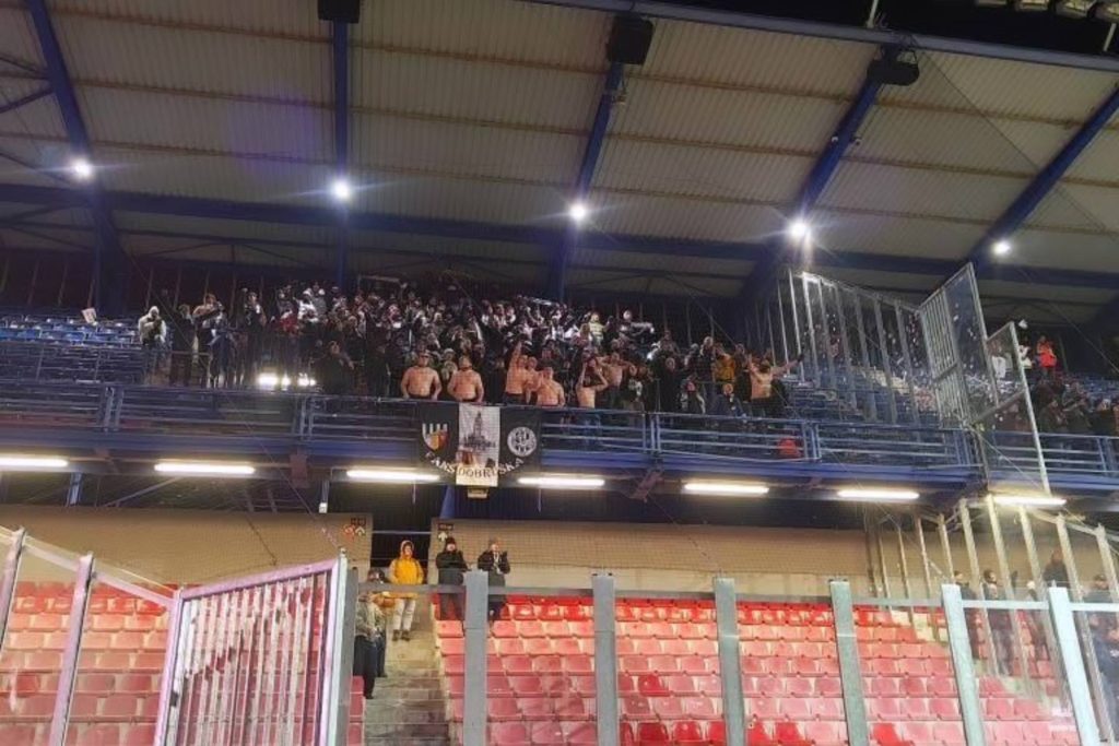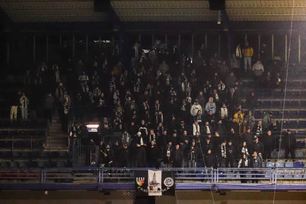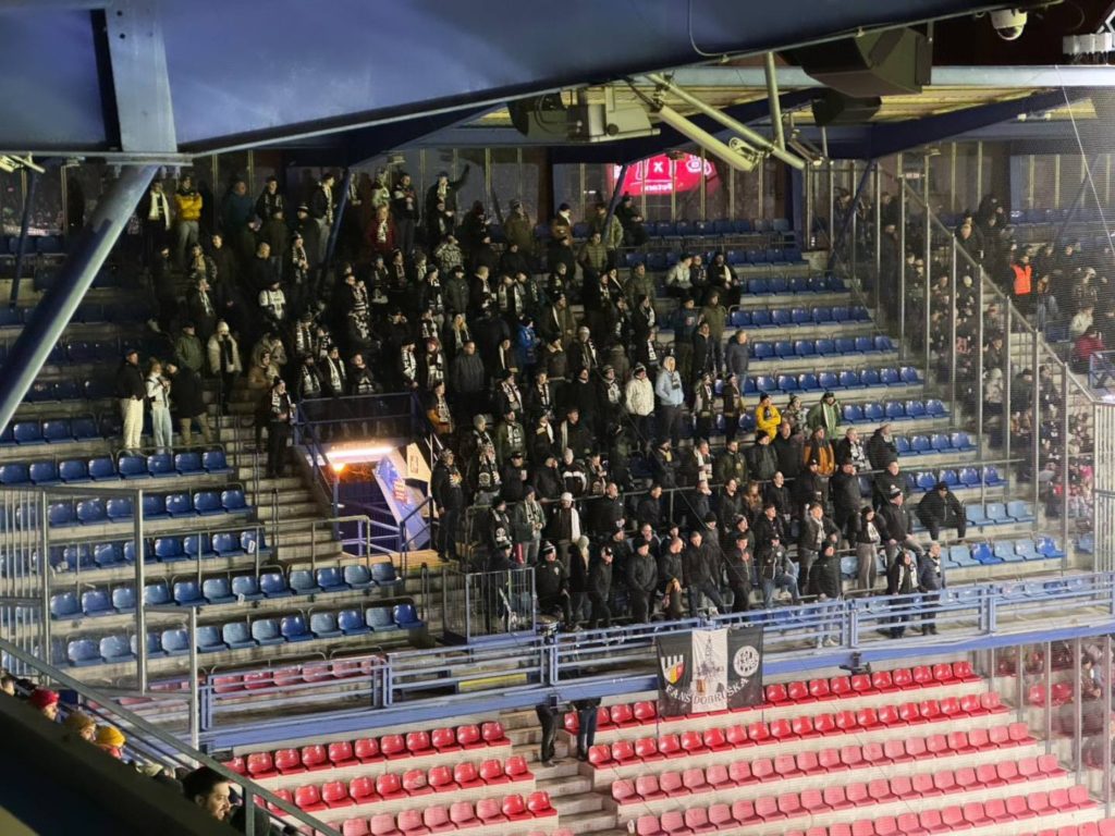 Nekonal se organizovaný výjezd, takže si každý podle svého vybral, jak se na zápas dopraví. V sektoru hostů se před výkopem utkání schází celkem slušných 165 výjezdníků. Naše podpora byla bez jakékoliv optické prezentace, jen snad s jedinou vlajkou. Fandění od začátku bylo na velmi vysoké úrovni a chvílemi to mělo (holky prominou) opravdu koule.